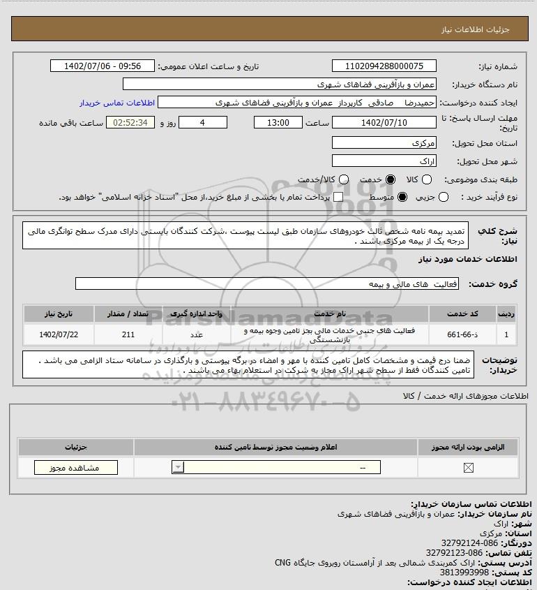 شرح کلی نیاز: تمدید بیمه نامه شخص ثالث خودروهای سازمان طبق لیست پیوست ،شرکت کنندگان بایستی دارای مدرک سطح توانگری مالی درجه یک از بیمه مرکزی باشند .