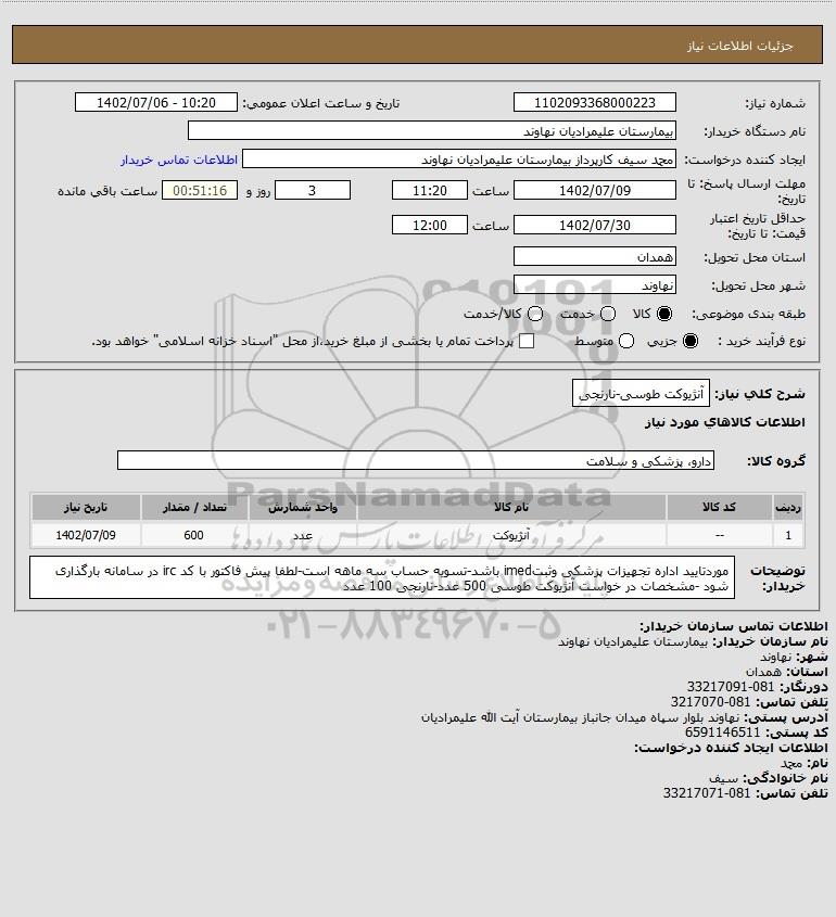 توضیحات خریدار:موردتایید اداره تجهیزات پزشکی وثبتimed باشد-تسویه حساب سه ماهه است-لطفا پیش فاکتور با کد irc در سامانه بارگذاری شود -مشخصات در خواست آنژیوکت طوسی 500 عدد-نارنجی 100 عدد