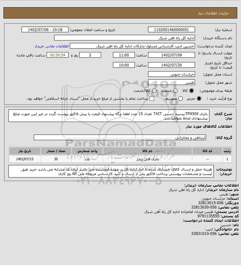 شرح کلی نیاز: باتری TP9300بیسیم دستی TAIT تعداد 15 عدد