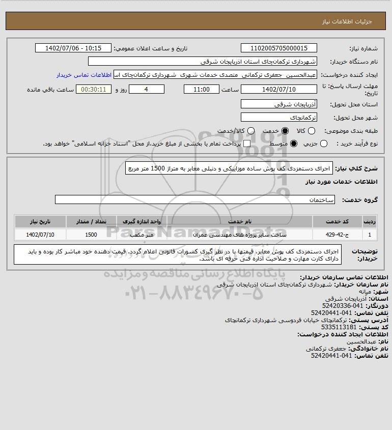 شرح کلی نیاز: اجرای دستمزدی کف پوش ساده موزاییکی و دنبلی معابر به متراژ 1500 متر مربع