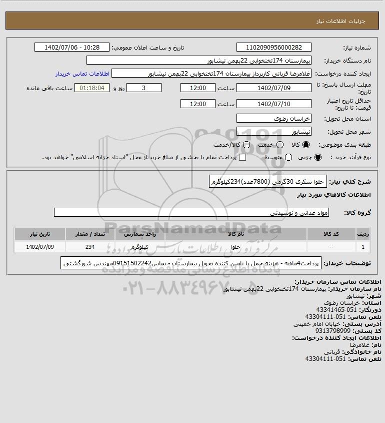 شرح کلی نیاز: حلوا شکری 30گرمی (7800عدد)234کیلوگرم