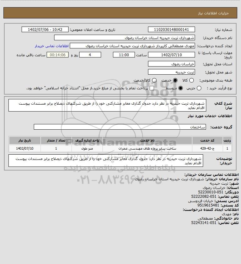 توضیحات خریدار:شهرداری تربت حیدریه در نظر دارد جدول گذاری معابر مشارکتی خود را از طریق شرکتهای ذیصلاح برابر مستندات پیوست اقدام نماید