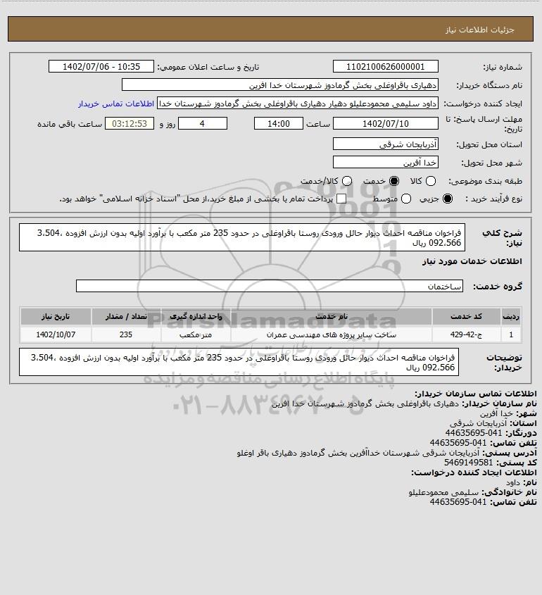 توضیحات خریدار:فراخوان مناقصه احداث دیوار حائل ورودی روستا باقراوغلی در حدود 235 متر مکعب با برآورد اولیه بدون ارزش افزوده 3،504،092،566 ریال