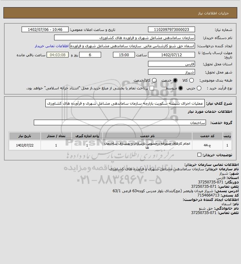 شرح کلی نیاز: عملیات اجرای شیشه سکوریت بازارچه سازمان ساماندهی مشاغل شهری و فرآورده های کشاورزی