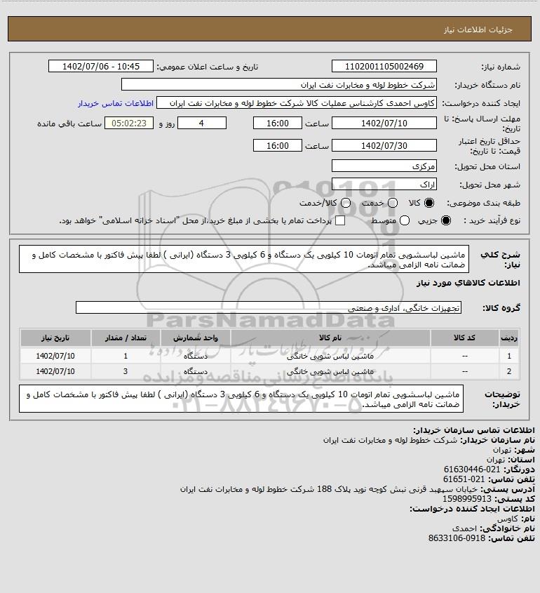 شرح کلی نیاز: ماشین لباسشویی تمام اتومات 10 کیلویی یک دستگاه و 6 کیلویی 3 دستگاه (ایرانی ) لطفا پیش فاکتور با مشخصات کامل و ضمانت نامه الزامی میباشد.