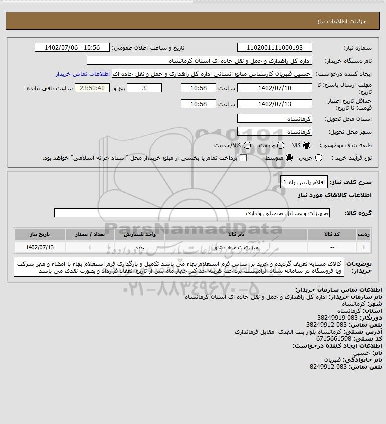 استعلام اقلام پلیس راه 1, استعلام اقلام پلیس راه 1