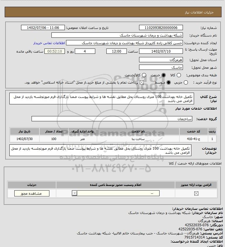 نام دستگاه خریدار:شبکه بهداشت و درمان شهرستان جاسک