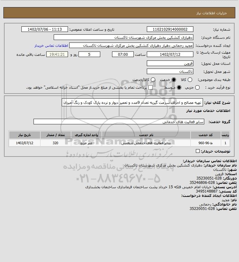 شرح کلی نیاز: تهیه مصالح و اجرای سرعت گیربه تعداد 9عدد و تعمیر دیوار و نرده پارک کودک و رنگ آمیزی