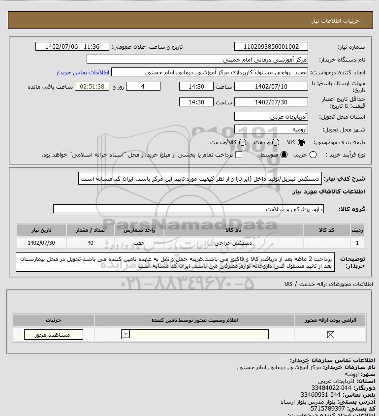 | 1 | -- | دستکش جراحی | جفت | 40 | 1402/07/30 |