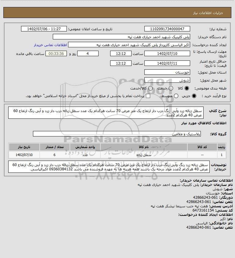 شرح کلی نیاز: سطل زباله زرد وآبی رنگ درب دار ارتفاع یک متر عرض 70 سانت هرکدام یک عدد