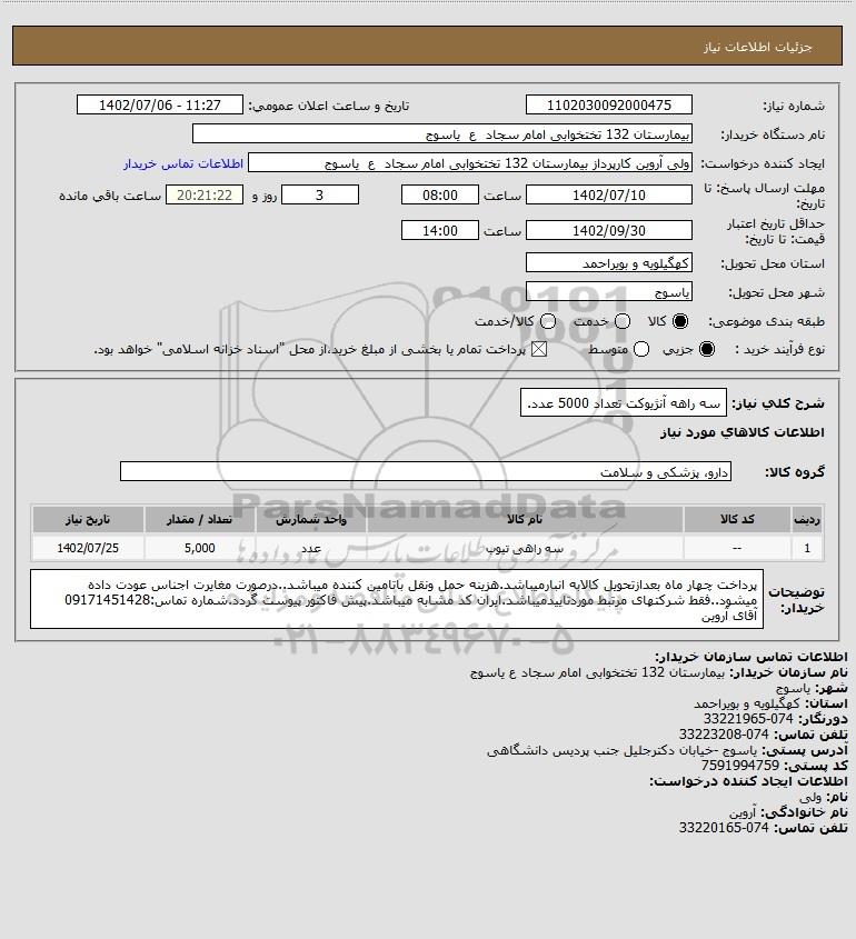 شرح کلی نیاز: سه راهه آنژیوکت تعداد 5000 عدد.