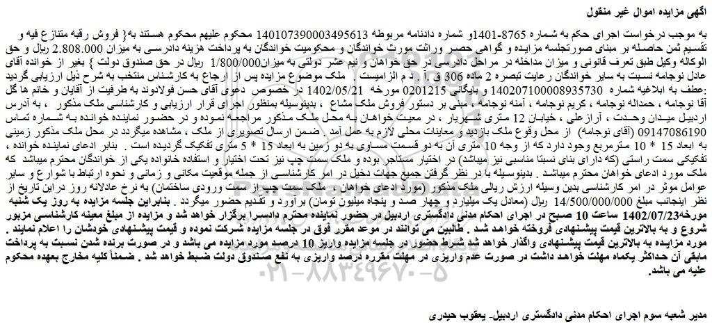 به موجب درخواست اجرای حکم به شماره 8765-1401و شماره دادنامه مربوطه 140107390003495613 محکوم علیهم محکوم هستند به{ فروش رقبه متنازع فیه و تقسیم ثمن حاصله بر مبنای صورتجلسه مزایده و گواهی حصر وراثت مورث خواندگان و محکومیت خواندگان به پرداخت هزینه دادرسی به میزان 2.808.000 ریال و حق الوکاله وکیل طبق تعرف قانونی و میزان مداخله در مراحل دادرسی در حق خواهان و نیم عشر دولتی به میزان1/800/000 ریال در حق صندوق دولت } بغیر از خوانده آقای عادل نوجامه نسبت به سایر خواندگان رعایت تبصره 2 ماده 306 ق .آ . د م الزامیست . ملک موضوع مزایده پس از ارجاع به کارشناس منتخب به شرح ذیل ارزیابی گردید :عطف به ابلاغیه شماره 140207100008935730 و بایگانی 0201215 مورخه 1402/05/21 در خصوص دعوی آقای حسن فولادوند به طرفیت از آقایان و خانم ها گل آقا نوجامه ، حمداله نوجامه ، کریم نوجامه ، آمنه نوجامه ، مبنی بر دستور فروش ملک مشاع ، بدینوسیله بمنظور اجرای قرار ارزیابی و کارشناسی ملک مذکور ، به آدرس اردبیل میدان وحدت ، آرازعلی ، خیابان 12 متری شهریار ، در معیت خواهان به محل ملک مذکور مراجعه نموده و در حضور نماینده خوانده به شماره تماس 09147086190 (آقای نوجامه) از محل وقوع ملک بازدید و معاینات محلی لازم به عمل آمد . ضمن ارسال تصویری از ملک ، مشاهده میگردد در محل ملک مذکور زمینی به ابعاد 15 * 10 مترمربع وجود دارد که از وجه 10 متری آن به دو قسمت مساوی به دو زمین به ابعاد 15 * 5 متری تفکیک گردیده است . بنابر ادعای نماینده خوانده ، تفکیکی سمت راستی (که دارای بنای نسبتا مناسبی نیز میباشد) در اختیار مستاجر بوده و ملک سمت چپ نیز تحت اختیار و استفاده خانواده یکی از خواندگان محترم میباشد که ملک مورد ادعای خواهان محترم میباشد . بدینوسیله با در نظر گرفتن جمیع جهات دخیل در امر کارشناسی از جمله موقعیت مکانی و زمانی و نحوه ارتباط با شوارع و سایر عوامل موثر در امر کارشناسی بدین وسیله ارزش ریالی ملک مذکور (مورد ادعای خواهان ، ملک سمت چپ از سمت ورودی ساختمان) به نرخ عادلانه روز دراین تاریخ از نظر اینجانب مبلغ 14/500/000/000 ریال (معادل یک میلیارد و چهار صد و پنجاه میلیون تومان) برآورد و تقدیم حضور میگردد . بنابراین جلسه مزایده به روز یک شنبه مورخه1402/07/23 ساعت 10 صبح در اجرای احکام مدنی دادگستری اردبیل در حضور نماینده محترم دادسرا برگزار خواهد شد و مزایده از مبلغ معینه کارشناسی مزبور شروع و به بالاترین قیمت پیشنهادی فروخته خواهد شد . طالبین می توانند در موعد مقرر فوق در جلسه مزایده شرکت نموده و قیمت پیشنهادی خودشان را اعلام نمایند . مورد مزایده به بالاترین قیمت پیشنهادی واگذار خواهد شد شرط حضور در جلسه مزایده واریز 10 درصد مورد مزایده می باشد و در صورت برنده شدن نسبت به پرداخت مابقی آن حداکثر یکماه مهلت خواهد داشت در صورت عدم واریزی در مهلت مقرره درصد واریزی به نفع صندوق دولت ضبط خواهد شد . ضمناً کلیه مخارج بعهده محکوم علیه می باشد.