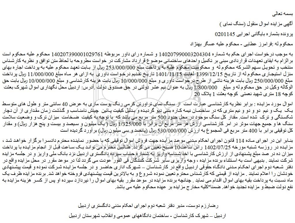 به موجب درخواست اجرای حکم به شماره 140207990003204304 و شماره رای داور مربوطه 140207390001029761 محکوم علیه محکوم است برالزام به ایفای تعهدات قراردادی مبنی بر تکمیل واحدهای ساختمانی موضوع قرارداد مشارکت در خواست مطروحه با لحاظ متن توافق و نظریه کارشناس منتخب و تحویل سهم الشرکه محکوم له و محکومیت محکوم علیه به پرداخت مبلغ 253/000/000 ریال از بابت تعهد محکوم علیه به پرداخت اجاره بهای منزل استیجاری محکوم له از تاریخ 1399/12/15 لغایت 1401/11/15 تاریخ تقدیم درخواست داوری به ازای هر ماه مبلغ 11/000/000 ریال پرداخت مبلغ 250/000/000 ریال بابت هزینه ناشی از طرح درخواست داوری و مبلغ 10/000/000 ریال بابت هزینه کارشناسی و مبلغ 10/000/000 ریال بابت حق الوکاله وکیل در حق محکوم له و مبلغ 1/800/000 ریال به عنوان نیم عشر دولتی در حق صندوق دولت .آدرس: اردبیل محل نگهداری اموال شهرک بعثت کوچه 18 متری شهید نعمتی کوچه بعثت 1 پلاک 20