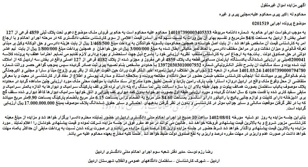 به موجب درخواست اجرای حکم به  شماره دادنامه مربوطه 140107390003405333 محکوم علیه محکوم است به حکم بر فروش ملک موضوع دعوی تحت پلاک ثبتی 4859 فرعی از 127 اصلی بخش 3 اردبیل به مساحت 84/6 مترمربع و تقسیم بهای آن بین وراث به نسبت سهم که بر اساس قیمت اعلامی از سوی کارشناس منتخب دادگستری که در مرحله اجرای احکام و با ارجاع امر به کارشناس قیمت آن مشخص خواهد شد ، از بابت اصل خواسته و همچنین محکومیت بالسویه خواندگان به پرداخت مبلغ 1/468/500 ریال از بابت هزینه دادرسی و حق الوکاله وکیل بر مبنای تعرفه قانونی و میزان دخالت وی در مراحل مختلف دادرسی با لحاظ تمبر مالیاتی ابطال شده به مبلغ 3/000/000 ریال در حق خواهان  و همچنین پرداخت مبلغ 1/800/000 ریال از بابت  نیم عشر دولتی در حق صندوق دولت . بات.جه به ارجاع امر به کارشناس منتخب  نظریه ارزیابی خود را بشرح ذیل جهت استحضار و بهره برداری لازم تقدیم می نمایم. احتراما عطف به پرونده کلاسه 0200041مبنی بر ارزیابی ششدانگ یکدستگاه اپارتمان مسکونی قطعه یک پلاک 4859 فرعی مفروز و مجزی شده از پلاک 4182 فرعی از 127 اصلی واقع در بخش سه اردبیل که از املاک ثبت شده بوده و سند مالکیت ان بشرح دفتر الکترونیکی شماره 139720303010007932 با حدودی مشخص بنام نصیبه پیری ثبت صادر گردیده سپس بموجب گواهی حصر وراثت شماره 140107390000794780-1401.03.24 صادره از شعبه 12 شورای حل اختلاف اردبیل نامبرده اخیر الذکر فوت وراث حین الفوت عبارتند از باقر پیری (زوج) مینا و سارا و مجتبی و اکبرجملگی بنام خانوادگی پیری میباشند لذا اینجانب کارشتاس منتخب ضمن حضور در محل دادگاه و مطالعه پرونده و ملاحظه اسناد و مدارک پیوستی و اطلاع از مفاد قرار کارشناسی در معیت و با معرفی متقاضی از محل وقوع ملک واقع در اردبیل دروازه استارا جنب پارک رامین بازدید و ضمن تطبیق حدود مندرج در سند مالکیت با موقعیت محلی ملک مورد ارزیابی چنین مشاهده گردید در محدوده پلاک موصوف یکباب ساختمان بصورت همکف پیلوت و چهار طبقه بالای ان با سازه اسکلت بتنی نما سنگ راه پله دارای نرده فلزی کف پارکینگ سرامیک و دیوارها به اندازه یکمتر سرامیک و مابقی سفید کاری شده با قدمت حدود 6 سال احداث گردیده و مورد ارزیابی طبقه اول بصورت دو خوابه بدون کمد دیواری کف پذیرایی و اتاق خوابها سرامیک دیوارها کاغذ دیواری شده سقف گچ بری اشپزخانه دارای کابینت و لوازم جانبی پکیج با رادیاتور دارای اسانسور بمساحت 84.60 متر مربع به انضمام تراس بمساحت 6.15 متر مربع بانضمام پارکینگ بمساحت 9.90متر مربع میباشد که با در نظر گرفتن موقعیت مکانی و سایر جوانب موثر در کارشناسی و بدون در نظر گرفتن بدهیهای  احتمالی و سایر حقوق ششدانگ پلاک موصوف بمبلغ 17.000.000.000 ریال ارزیابی  گردیده است.