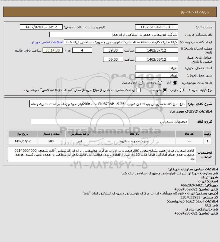 شرح کلی نیاز: مایع تمیز کننده سرویس بهداشتی هواپیما PN:873AP-19-25-تعداد:200لیتر-نحوه و زمان پرداخت مالی:دو ماه