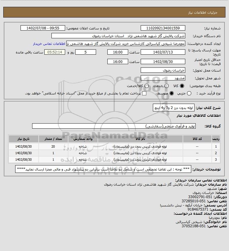 استعلام لوله بدون درز 2 و3 و4 اینچ, استعلام لوله بدون درز 2 و3 و4 اینچ