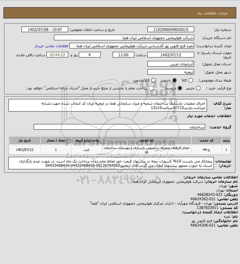 شرح کلی نیاز: اجرای عملیات بازسازی ساختمان شعبه و منزل سازمانی هما در ارومیه،ایران کد انتخاب شده جهت تشابه میباشد.بازدید07/10 ساعت10تا12