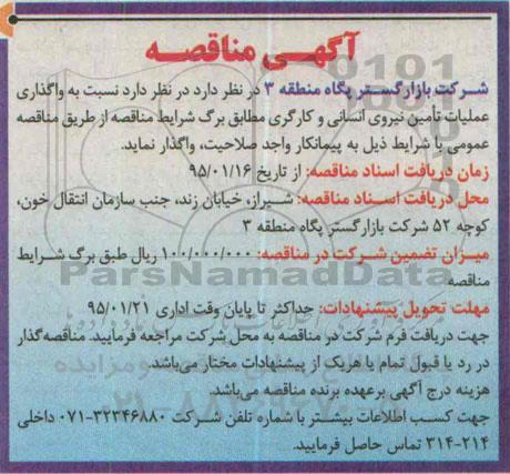 شرکت بازار گستر پگاه منطقه 3 در نظر دارد نسبت به واگذاری عملیات تأمین نیروی انسانی و کارگری مطابق برگ شرایط مناقصه از طریق مناقصه عمومی با شرایط ذیل به پیمانکار واجد صلاحیت، واگذار نماید.