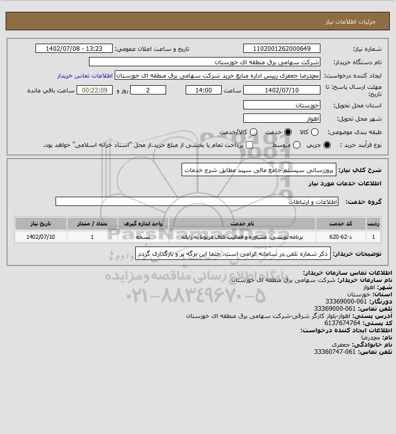 شرح کلی نیاز: بروزرسانی سیستم جامع مالی سپند مطابق شرح خدمات