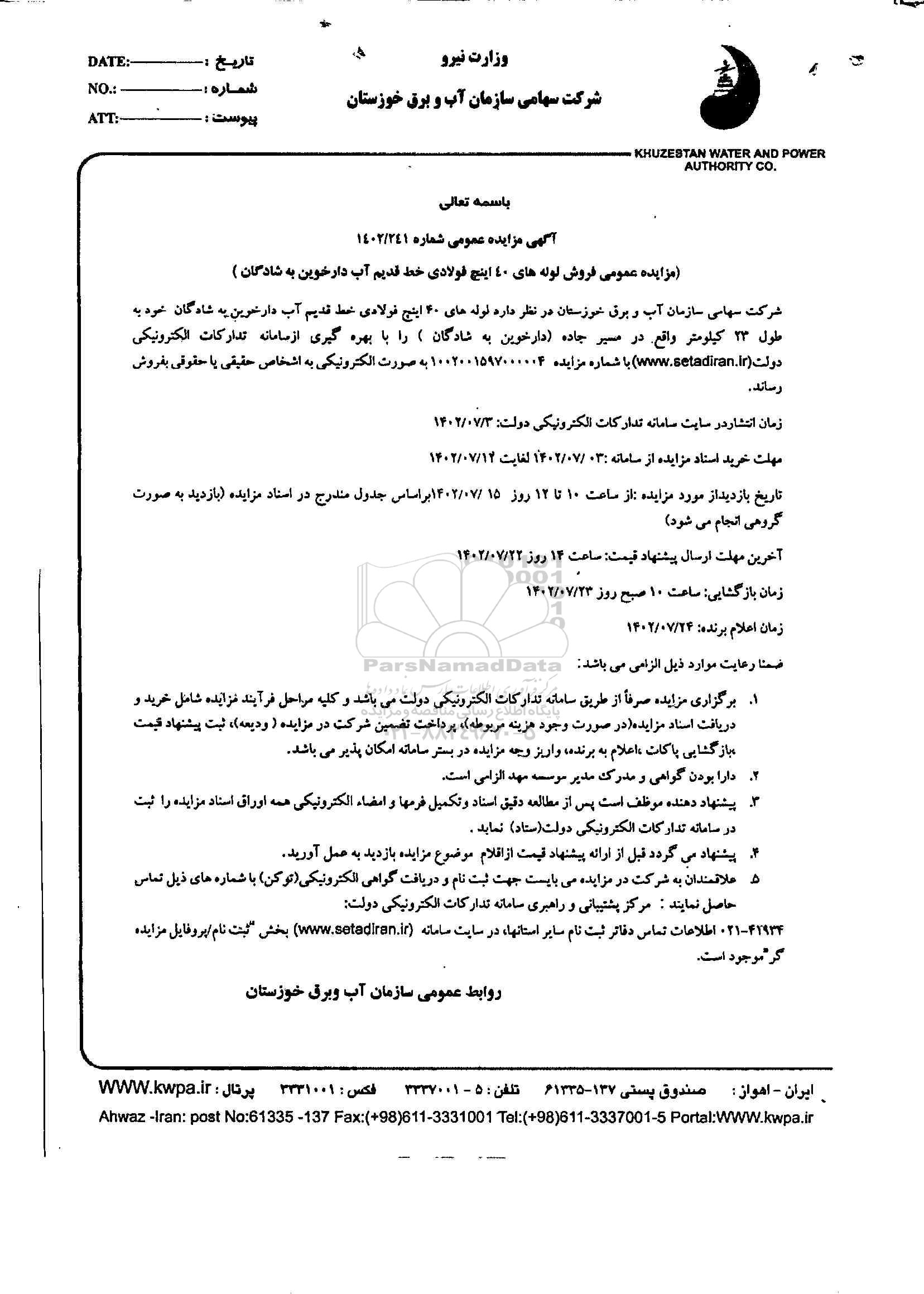 شرکت سهامی سازمان آب خوزستان در نظر دارد لوله های 40 اینچ فولادی خط قدیم آب دارخوین به شادگان  خود به طول 23 کیلومتر واقع درمسیر جاده (دارخوین به شادگان ) را با بهره گیری از  سامانه تدارکات الکترونیکی دولت سامانه ستاد با شماره مزایده 1002001597000004 به صورت الکترونیکی به فروش برساند