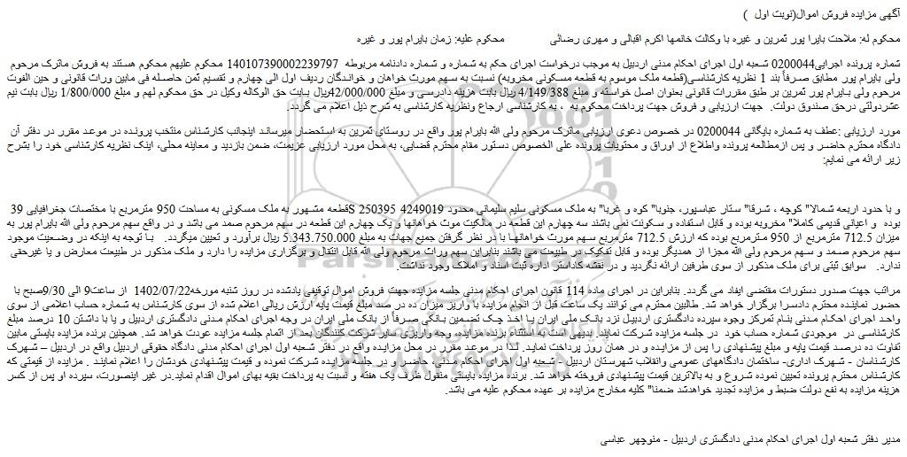 شماره پرونده اجرایی0200044 شعبه اول اجرای احکام مدنی اردبیل به موجب درخواست اجرای حکم به شماره و شماره دادنامه مربوطه  140107390002239797 محکوم علیهم محکوم هستند به فروش ماترک مرحوم ولی بایرام پور مطابق صرفاً بند 1 نظریه کارشناسی(قطعه ملک موسوم به قطعه مسکونی مخروبه) نسبت به سهم مورث خواهان و خواندگان ردیف اول الی چهارم و تقسیم ثمن حاصله فی مابین وراث قانونی و حین الفوت مرحوم ولی بایرام پور ثمرین بر طبق مقررات قانونی بعنوان اصل خواسته و مبلغ 4/149/388 ریال بابت هزینه دادرسی و مبلغ 42/000/000ریال بابت حق الوکاله وکیل در حق محکوم لهم و مبلغ 1/800/000 ریال بابت نیم عشردولتی درحق صندوق دولت.  جهت ارزیابی و فروش جهت پرداخت محکوم به  ، به کارشناسی ارجاع ونظریه کارشناسی به شرح ذیل اعلام می گردد.