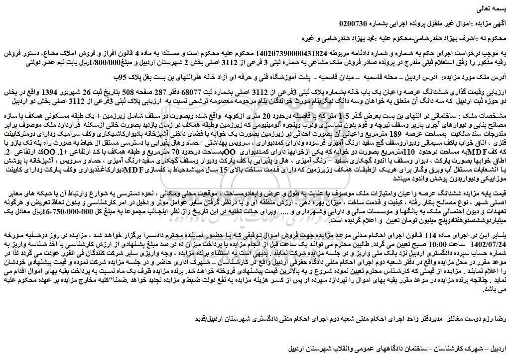 آگهی مزایده :اموال غیر منقول پرونده اجرایی بشماره 0200730