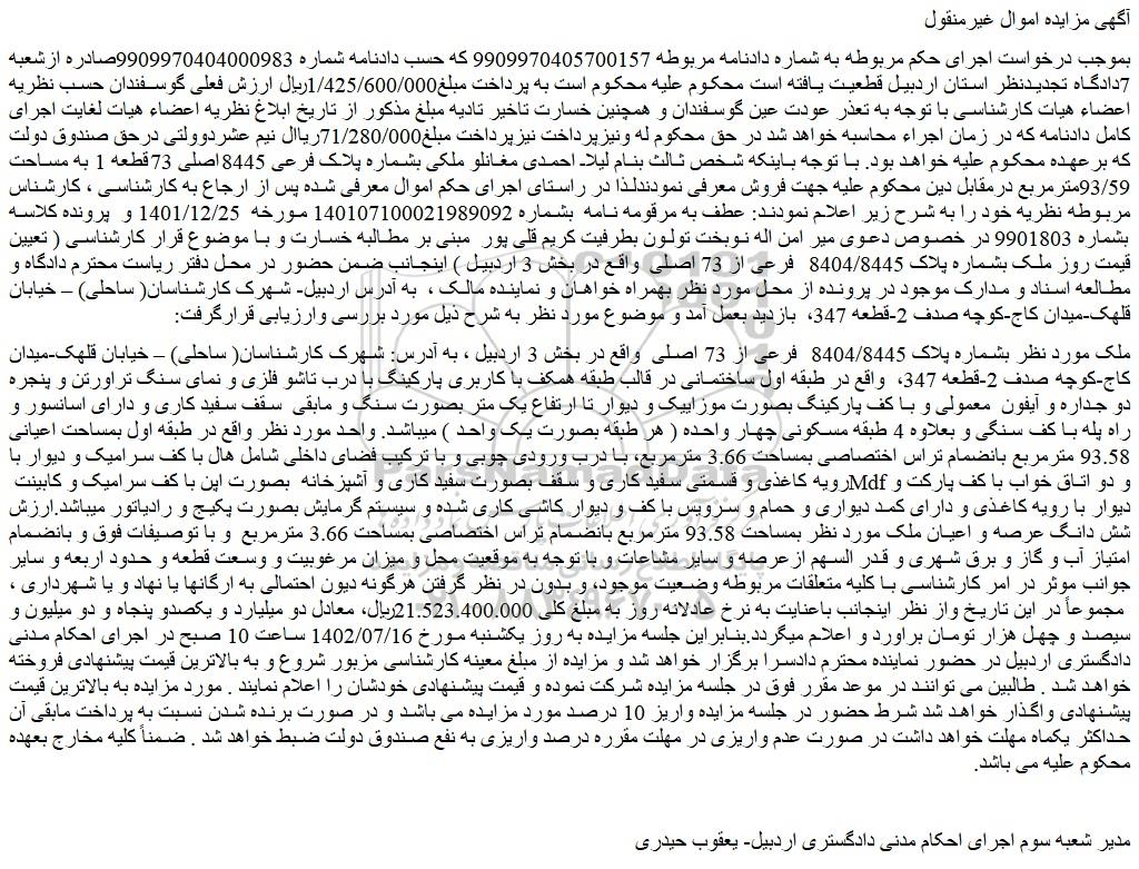 بموجب درخواست اجرای حکم مربوطه به شماره دادنامه مربوطه 9909970405700157 که حسب دادنامه شماره 9909970404000983صادره ازشعبه 7دادگاه تجدیدنظر استان اردبیل قطعیت یافته است محکوم علیه محکوم است به پرداخت مبلغ1/425/600/000ریال ارزش فعلی گوسفندان حسب نظریه اعضاء هیات کارشناسی با توجه به تعذر عودت عین گوسفندان و همچنین خسارت تاخیر تادیه مبلغ مذکور از تاریخ ابلاغ نظریه اعضاء هیات لغایت اجرای کامل دادنامه که در زمان اجراء محاسبه خواهد شد در حق محکوم له ونیزپرداخت نیزپرداخت مبلغ71/280/000ریاال نیم عشردوولتی درحق صندوق دولت که برعهده محکوم علیه خواهد بود. با توجه باینکه شخص ثالث بنام لیلا احمدی مغانلو ملکی بشماره پلاک فرعی 8445اصلی 73قطعه 1 به مساحت 93/59مترمربع درمقابل دین محکوم علیه جهت فروش معرفی نمودندلذا در راستای اجرای حکم اموال معرفی شده پس از ارجاع به کارشناسی ، کارشناس مربوطه نظریه خود را به شرح زیر اعلام نمودند: عطف به مرقومه نامه بشماره 140107100021989092 مورخه 1401/12/25 و پرونده کلاسه بشماره 9901803 در خصوص دعوی میر امن اله نوبخت تولون بطرفیت کریم قلی پور مبنی بر مطالبه خسارت و با موضوع قرار کارشناسی ( تعیین قیمت روز ملک بشماره پلاک 8404/8445 فرعی از 73 اصلی واقع در بخش 3 اردبیل ) اینجانب ضمن حضور در محل دفتر ریاست محترم دادگاه و مطالعه اسناد و مدارک موجود در پرونده از محل مورد نظر بهمراه خواهان و نماینده مالک ، به آدرس اردبیل- شهرک کارشناسان( ساحلی) – خیابان قلهک-میدان کاج-کوچه صدف 2-قطعه 347، بازدید بعمل آمد و موضوع مورد نظر به شرح ذیل مورد بررسی وارزیابی قرارگرفت:
