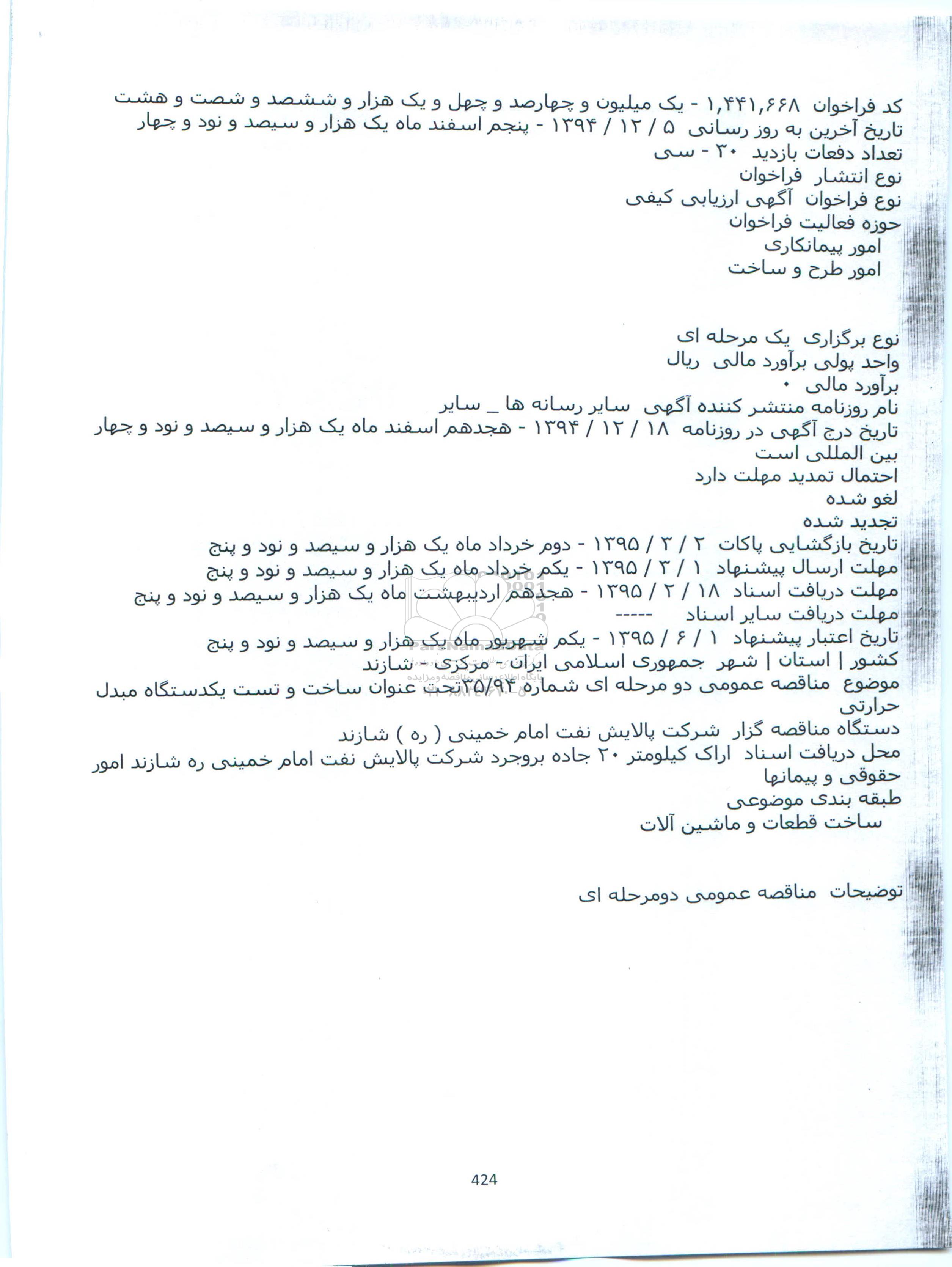 موضوع مناقصه عمومی دو مرحله ای شماره ۹۴/۳۵تحت عنوان ساخت و تست یکدستگاه مبدل حرارتی