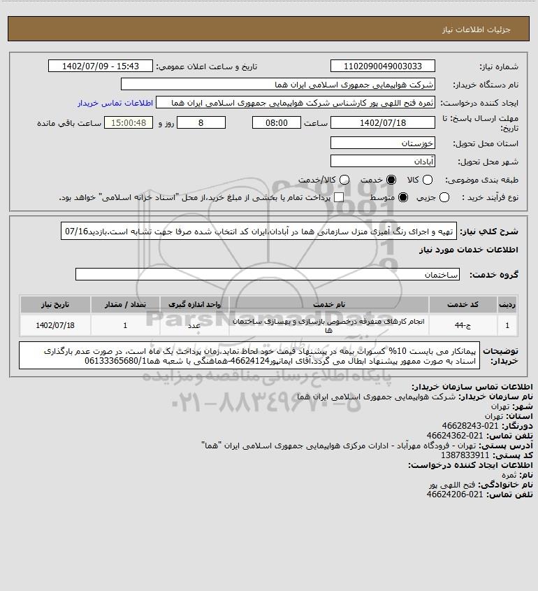 شرح کلی نیاز: تهیه و اجرای رنگ آمیزی منزل سازمانی هما در آبادان،ایران کد انتخاب شده صرفا جهت تشابه است.بازدید07/16