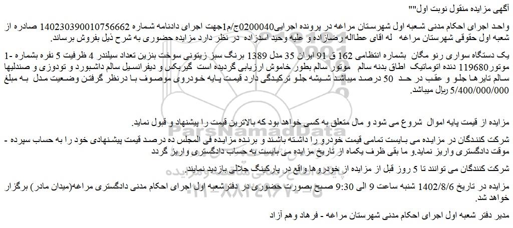 مزایده در تاریخ 1402/8/6 شنبه ساعت 9 الی 9:30 صبح بصورت حضوری در دفترشعبه اول اجرای احکام مدنی دادگستری مراغه(میدان مادر) برگزار خواهد شد.