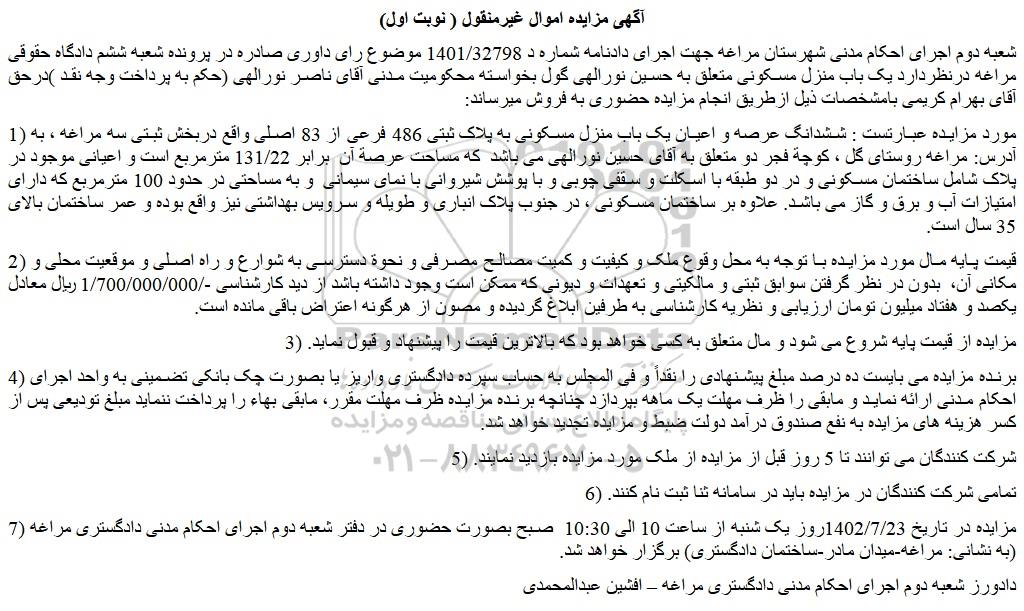 شعبه دوم اجرای احکام مدنی شهرستان مراغه جهت اجرای دادنامه شماره د 1401/32798 موضوع رای داوری صادره در پرونده شعبه ششم دادگاه حقوقی مراغه درنظردارد یک باب منزل مسکونی متعلق به حسین نورالهی گول بخواسته محکومیت مدنی آقای ناصر نورالهی (حکم به پرداخت وجه نقد )درحق آقای بهرام کریمی بامشخصات ذیل ازطریق انجام مزایده حضوری به فروش میرساند: