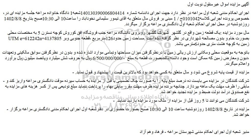 ،اجرای احکام مدنی شعبه اول مراغه در نظر دارد جهت اجرای دادنامه شماره  140130390006804414شعبه1 دادگاه خانواده مراغه جلسه مزایده ای در خصوص پرونده اجرایی کلاسه0101042ج / 1 مبنی بر فروش مال متعلق به اقای تیمور سلیمانی نخوداباد را ساعت10 الی 10:30صبح بتاریخ 1402/8/8 روزدوشنبه در محل اجرای احکام شعبه اول دادگستری مراغه برگزار میگردد.