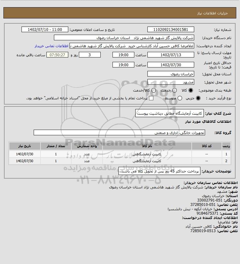 | 2 | -- | کابینت آزمایشگاهی | عدد | 1 | 1402/07/30 |