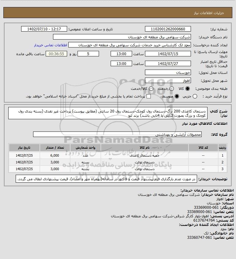 شرح کلی نیاز: دستمال کاغذی 200 برگ-دستمال رول کوچک-دستمال رول 20 سانتی (مطابق پیوست) پرداخت غیر نقدی