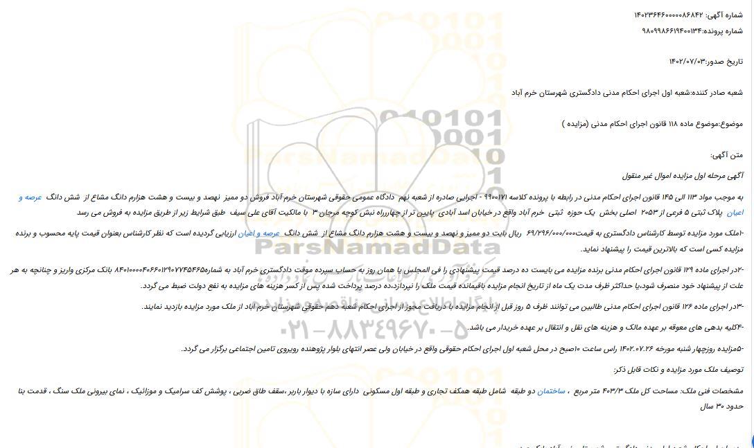 به موجب مواد 113 الی 145 قانون اجرای احکام مدنی در رابطه با پرونده کلاسه 9900171 - اجرایی صادره از شعبه نهم دادگاه عمومی حقوقی شهرستان خرم آباد فروش دو ممیز نهصد و بیست و هشت هزارم دانگ مشاع از شش دانگ عرصه و اعیان پلاک ثبتی 5 فرعی از 2053 اصلی بخش یک حوزه ثبتی خرم آباد واقع در خیابان اسد آبادی پایین تر از چهاررراه نبش کوچه مرجان 3 با مالکیت آقای علی سیف طبق شرایط زیر از طریق مزایده به فروش می رسد