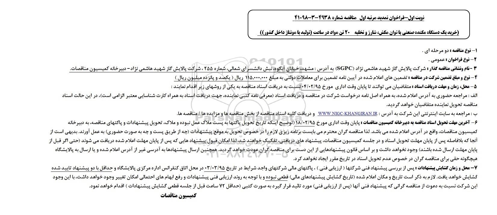 نام و نشانی مناقصه گذار: شرکت پالایش گاز شهید هاشمی نژاد (SGPC) به آدرس: مشهد، خیابان آبکوه، نبش دانشسرای شمالی، شماره 255 ، شرکت پالایش گاز شهید هاشمی نژاد، دبیرخانه کمیسیون منقاصات