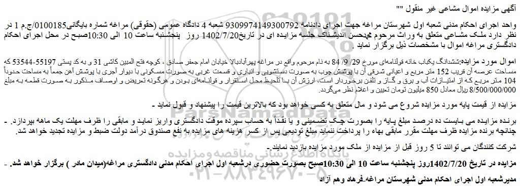 - مزایده در تاریخ 1402/7/20روز پنجشنبه ساعت 10 الی 10:30صبح بصورت حضوری درشعبه اول اجرای احکام مدنی دادگستری مراغه(میدان مادر ) برگزار خواهد شد.