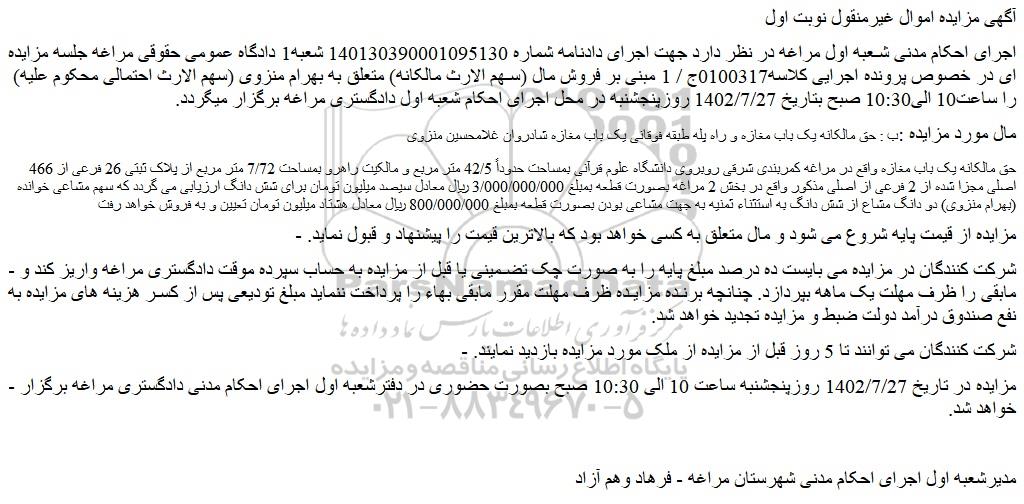 حق مالکانه یک باب مغازه واقع در مراغه کمربندی شرقی روبروی دانشگاه علوم قرآنی بمساحت حدوداً 42/5 متر مربع و مالکیت راهرو بمساحت 7/72 متر مربع از پلاک ثبتی 26 فرعی از 466 اصلی مجزا شده از 2 فرعی از اصلی مذکور واقع در بخش 2 مراغه بصورت قطعه بمبلغ 3/000/000/000 ریال معادل سیصد میلیون تومان برای شش دانگ ارزیابی می گردد که سهم مشاعی خوانده (بهرام منزوی) دو دانگ مشاع از شش دانگ به استثناء ثمنیه به جهت مشاعی بودن بصورت قطعه بمبلغ 800/000/000 ریال معادل هشتاد میلیون تومان تعیین و به فروش خواهد رفت