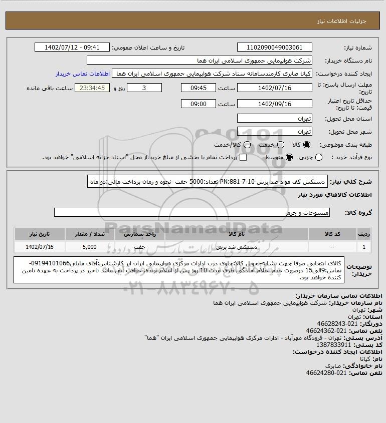 استعلام دستکش کف مواد ضد برش PN:881-7-10-تعداد:5000 جفت -نحوه و زمان پرداخت مالی:دو ماه, استعلام دستکش کف مواد ضد برش PN:881-7-10-تعداد:5000 جفت -نحوه و زمان پرداخت مالی:دو ماه