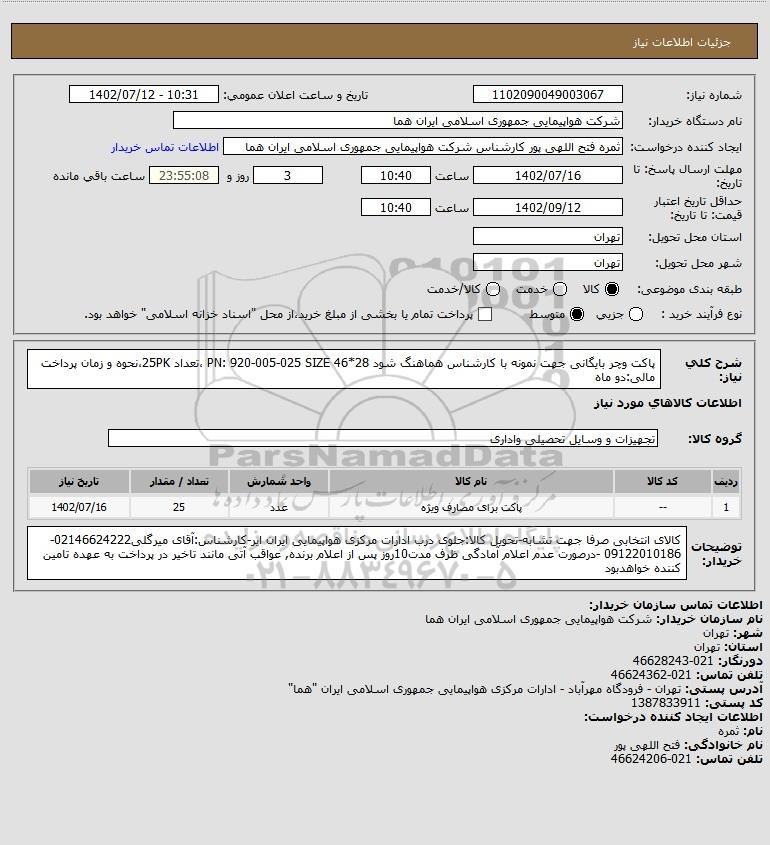 شرح کلی نیاز: پاکت وچر بایگانی جهت نمونه با کارشناس هماهنگ شود PN: 920-005-025 SIZE 46*28 ،تعداد 25PK،نحوه و زمان پرداخت مالی:دو ماه