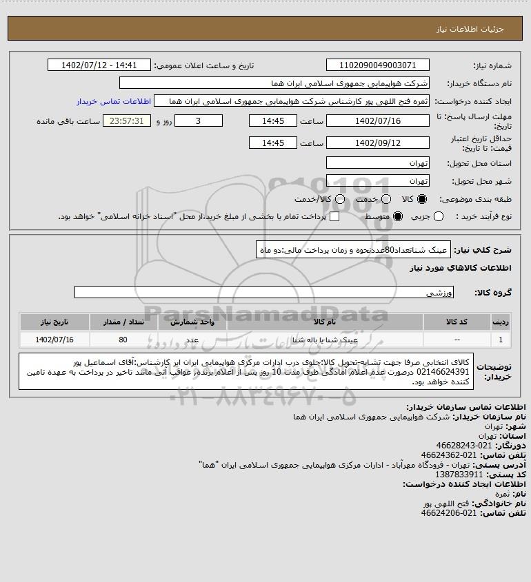 شرح کلی نیاز: عینک شناتعداد80عددنحوه و زمان پرداخت مالی:دو ماه