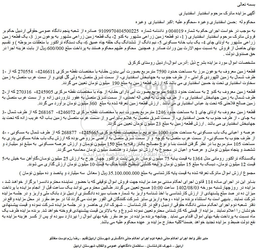 به موجب در خواست اجرای حکم به شماره 004019 و دادنامه شماره 9109970404500225 صادره از شعبه پنجم دادگاه عمومی حقوقی اردبیل حکم بر فروش ماترک مرحوم اسفندیار اسفندیاری ( 1- دو قطعه زمین زراعی مشهور به کدو 2- یک قطعه زمین زراعی مشهور به یوغون مرز 3- یک قطعه زمین زراعی مشهور به اوتای چای 4- یک باب خانه مسکونی 5- نیم دانگ از ششدانگ یک حلقه چاه عمیق 6- یک دستگاه تراکتور با متعلقات مربوطه ) و تقسیم بهای حاصل از فروش به نسبت سهم الارث بین وراث صادر و همچنین محکوم علیهم محکوم هستند به پرداخت مبلغ 600/000 ریال از بابت هزینه اجرا در حق صندوق دولت .