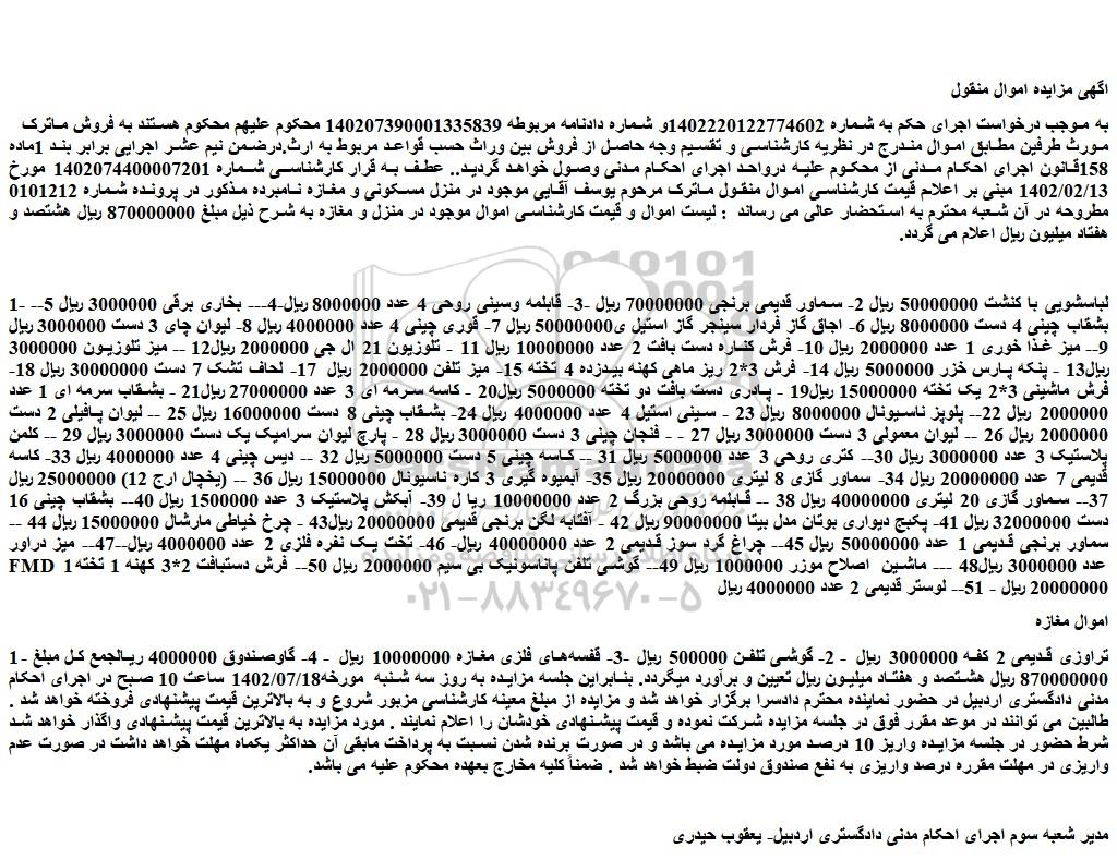 به موجب درخواست اجرای حکم به شماره 1402220122774602و شماره دادنامه مربوطه 140207390001335839 محکوم علیهم محکوم هستند به فروش ماترک مورث طرفین مطابق اموال مندرج در نظریه کارشناسی و تقسیم وجه حاصل از فروش بین وراث حسب قواعد مربوط به ارث.درضمن نیم عشر اجرایی برابر بند 1ماده 158قانون اجرای احکام مدنی از محکوم علیه درواحد اجرای احکام مدنی وصول خواهد گردید.. عطف به قرار کارشناسی شماره 1402074400007201 مورخ 1402/02/13 مبنی بر اعلام قیمت کارشناسی اموال منقول ماترک مرحوم یوسف آقایی موجود در منزل مسکونی و مغازه نامبرده مذکور در پرونده شماره 0101212 مطروحه در آن شعبه محترم به استحضار عالی می رساند : لیست اموال و قیمت کارشناسی اموال موجود در منزل و مغازه به شرح ذیل مبلغ 870000000 ریال هشتصد و هفتاد میلیون ریال اعلام می گردد.