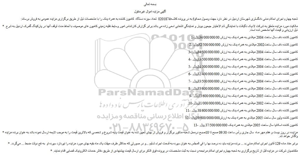 شعبه چهارم اجرای احکام مدنی دادگستری شهرستان اردبیل در نظر دارد جهت وصول محکومٌ به در پرونده کلاسه0201874 تعداد سیزده دستگاه کامیون کشنده به همراه یدک را با مشخصات ذیل از طریق برگزاری مزایده عمومی به فروش برساند: