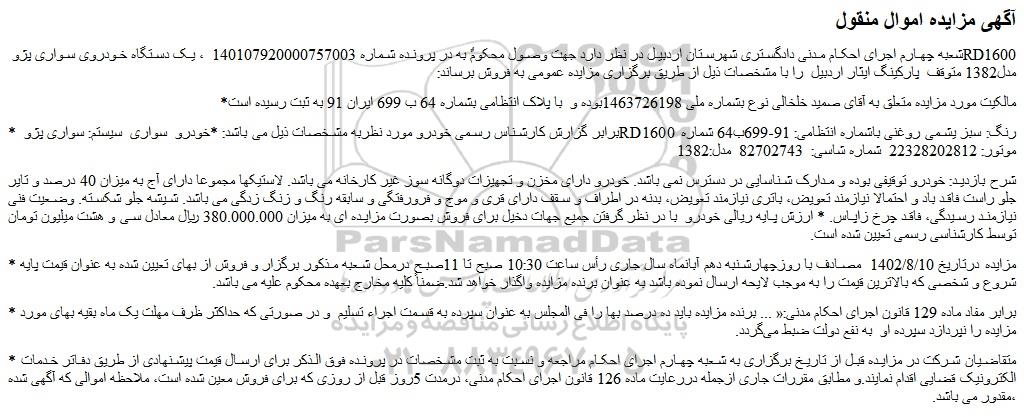 شعبه چهارم اجرای احکام مدنی دادگستری شهرستان اردبیل در نظر دارد جهت وصول محکومٌ به در پرونده شماره 140107920000757003 ، یک دستگاه خودروی سواری پژو RD1600 مدل1382 متوقف پارکینگ ایثار اردبیل را با مشخصات ذیل از طریق برگزاری مزایده عمومی به فروش برساند: