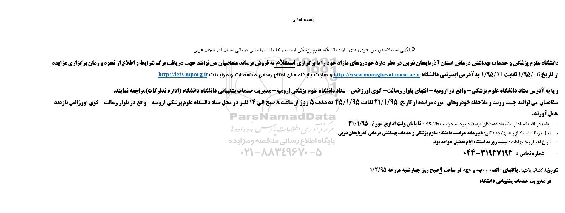دانشگاه علوم پزشکی ارومیه و خدمات بهداشتی درمانی استان آذربایجان غربی در نظر دارد  خودروهای مازاد خود را با برگزاری استعلام به فروش برساند. متقاضیان می توانند جهت دریافت برگ شرایط و اطلاع از نحوه و زمان برگزاری مزایده از تاریخ 95.1.16 لغایت 95.1.31 به آدرس اینترنتی دانشگاه HTTP://WWWMONAGHESAT.UMSU.AC.IR  و سایت پایگاه ملی اطلاع رسانی مناقصات و مزایدات HTTP://IETS.MPORG.IR  و یا به آدرس ستاد دانشگاه علوم پزشکی واقع در ارومیه ، انتهای بلوار رسالت ، کوی اورژانس ، ستاد دانشگاه علوم پزشکی ارومیه ، مدیریت خدمات پشتیبانی دانشگاه ، اداره تدارکات مراجعه نمایند.