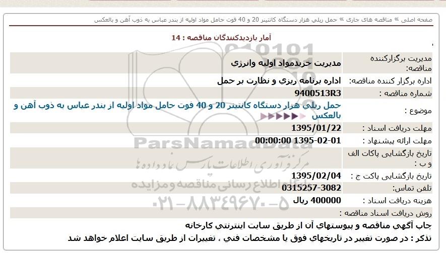مناقصه حمل ریلی هزار دستگاه کانتینر 20 و 40 فوت حامل مواد اولیه از کلیه افراد متخصص و شرکت‌ها واجد شرایط دعوت به عمل می‌آید در مناقصه با کد خبرگزاری پارس نماد: 642698 شرکت نمایند. این مناقصه در تاریخ 1395/01/18 شروع و مهلت آن تا تاریخ 1395/01/22 میباشد.