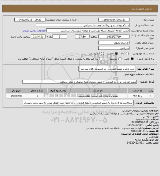 شرح کلی نیاز: خرید لوازم و تعمیر اساسی بنز اسپرینتر 315 سرخس