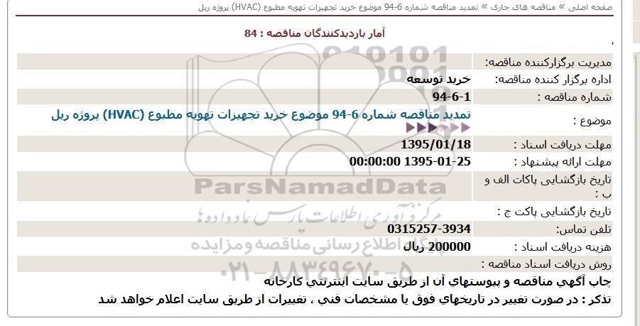 موضوع : تمدید مناقصه شماره 6-94 موضوع خرید تجهیزات تهویه مطبوع (HVAC) پروژه ریل