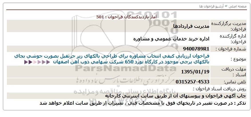 موضوع : فراخوان ارزیابی كیفی انتخاب مشاوره برای طراحی بالكهای زیر جرثقیل بصورت جوشی بجای بالكهای پرچی موجود در كارگاه نورد 650 شركت سهامی ذوب آهن اصفهان